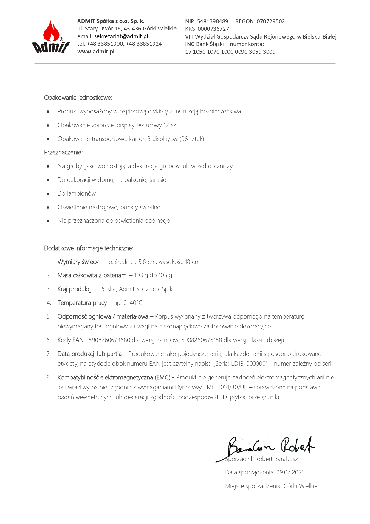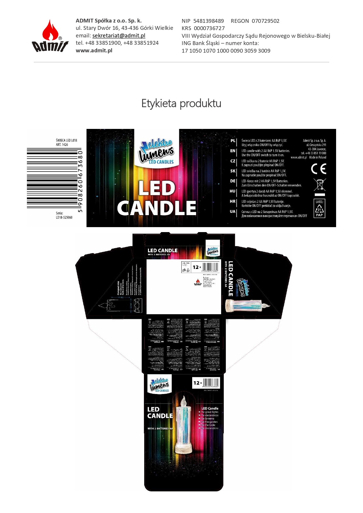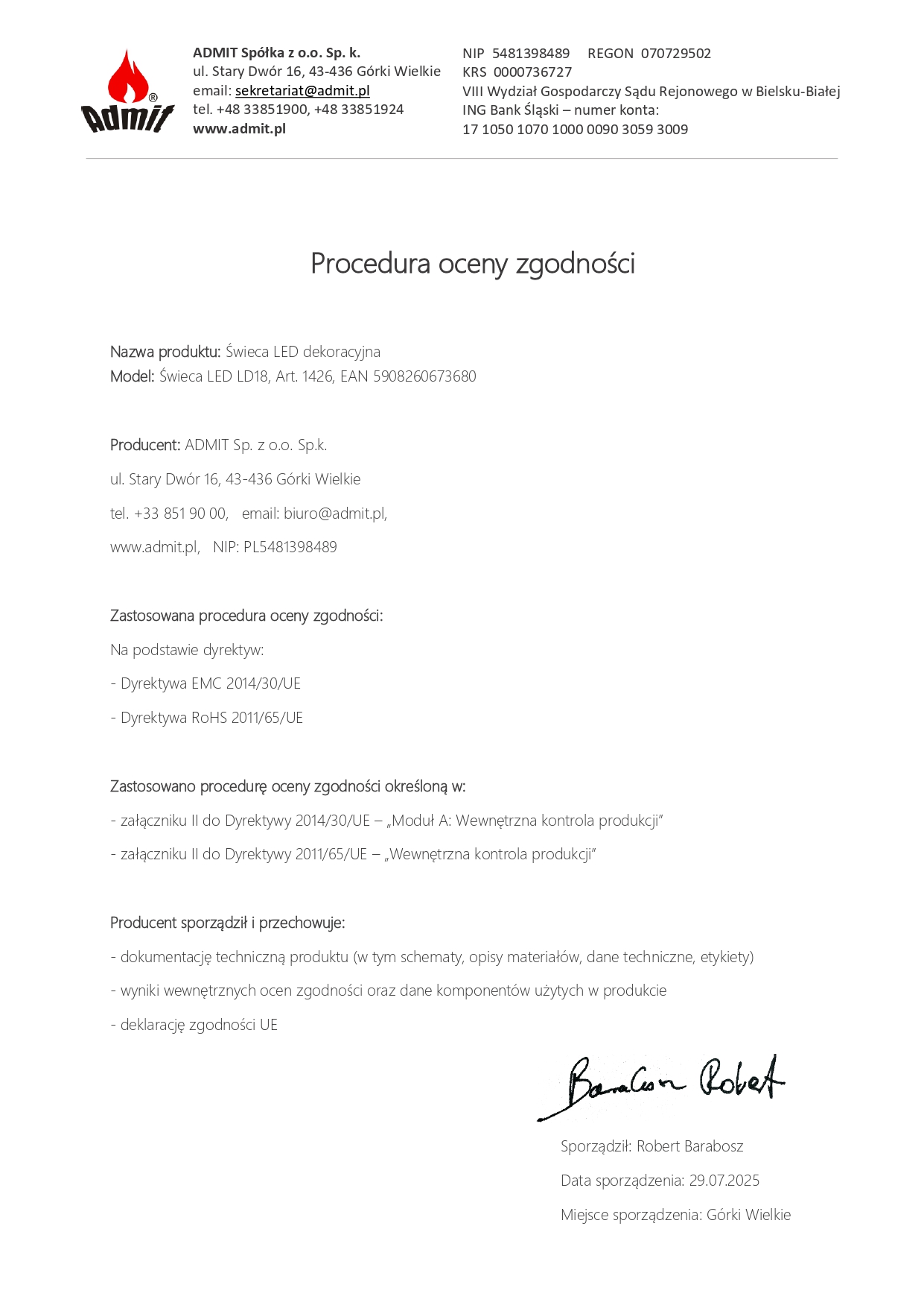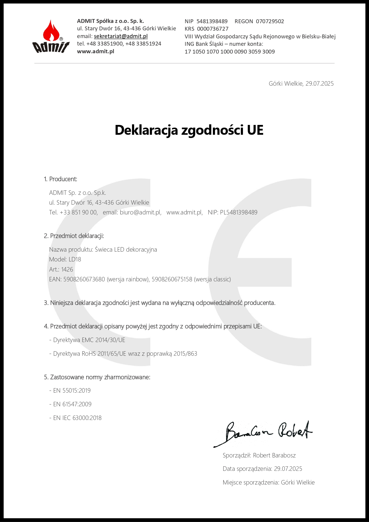 Níže uvádíme Prohlášení o shodě CE pro produkt LED svíčka / elektrická vložka model LD18, výrobce ADMIT Sp. z o. Ó. Sp.k. Dokument potvrzuje, že výrobek splňuje požadavky příslušných směrnic Evropské unie, zejména pokud jde o elektromagnetickou kompatibilitu (EMC) a omezení používání nebezpečných látek v elektrických a elektronických zařízeních (RoHS).