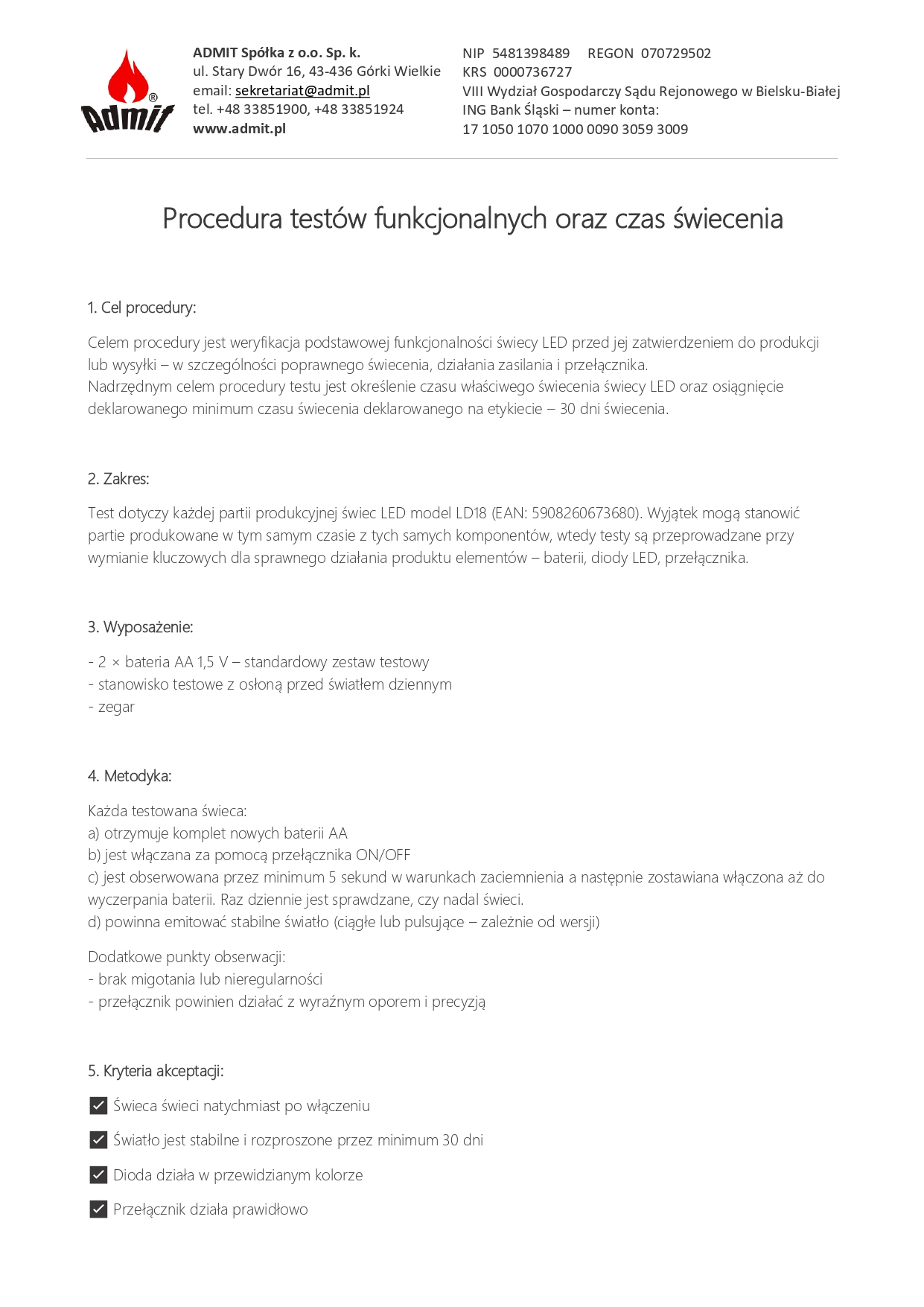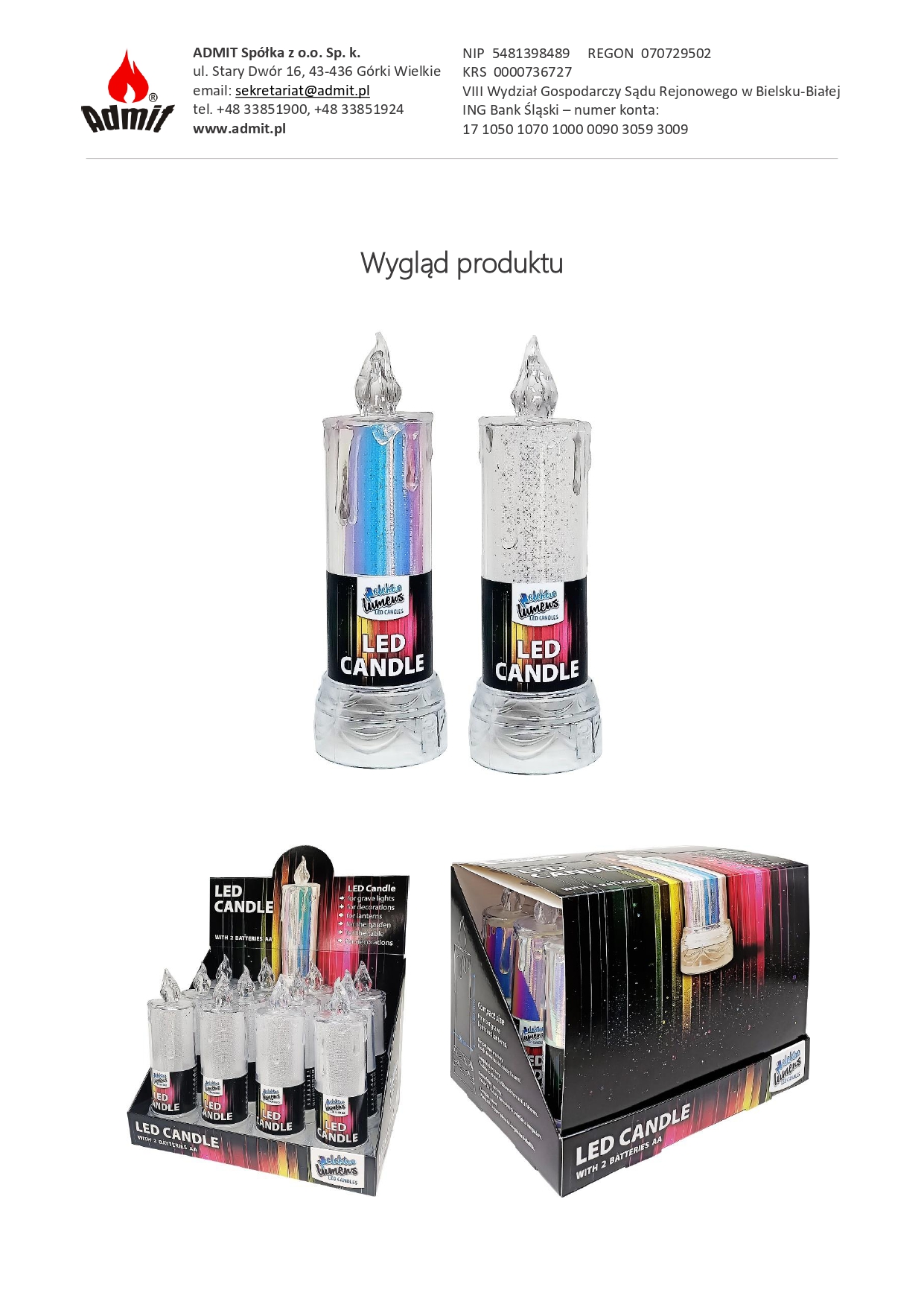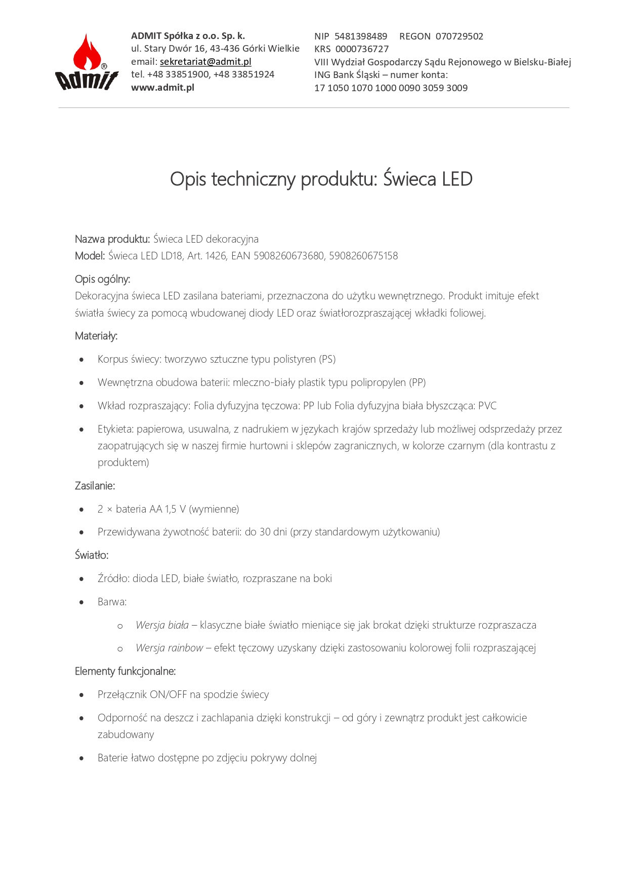 Níže uvádíme Prohlášení o shodě CE pro produkt LED svíčka / elektrická vložka model LD18, výrobce ADMIT Sp. z o. Ó. Sp.k. Dokument potvrzuje, že výrobek splňuje požadavky příslušných směrnic Evropské unie, zejména pokud jde o elektromagnetickou kompatibilitu (EMC) a omezení používání nebezpečných látek v elektrických a elektronických zařízeních (RoHS).