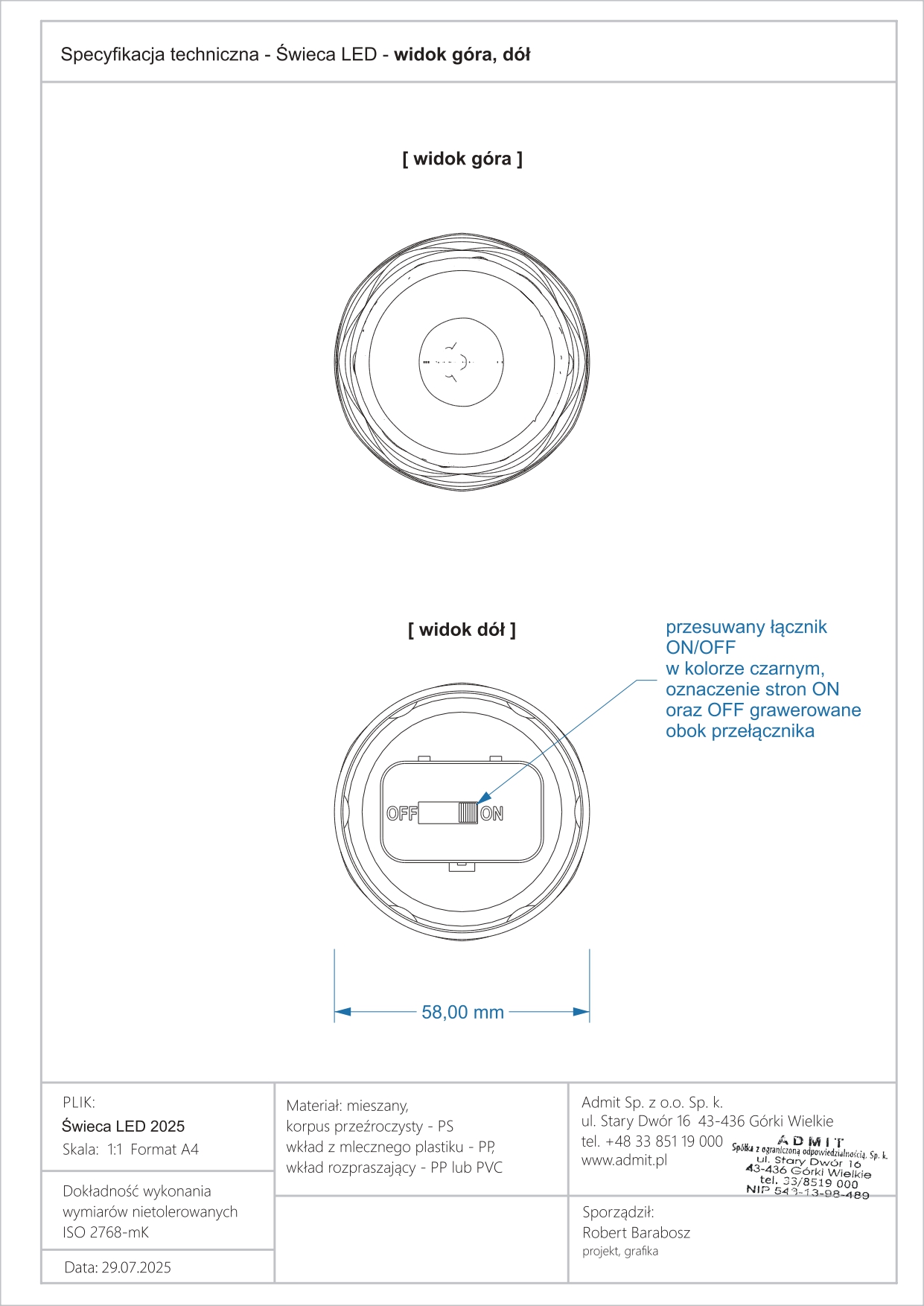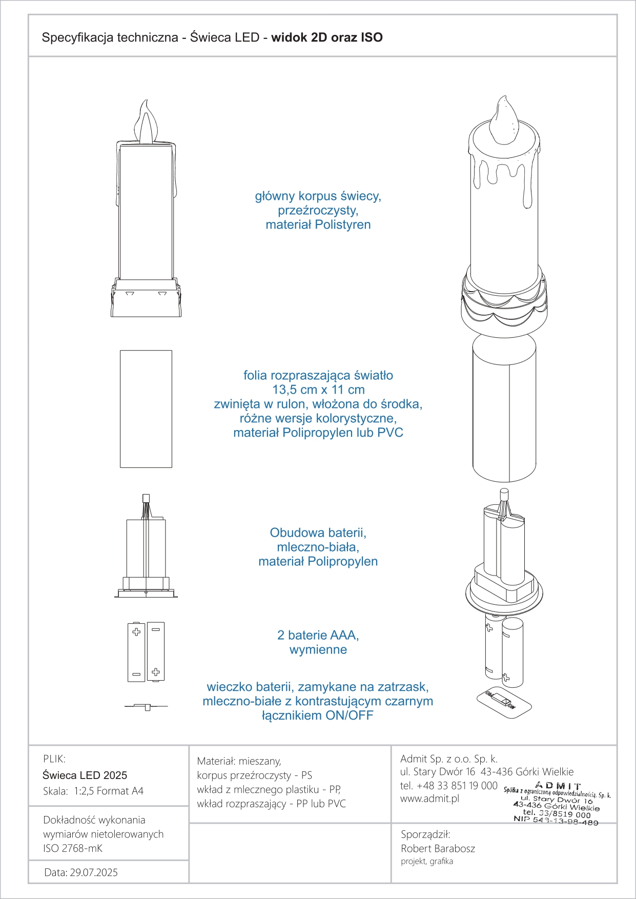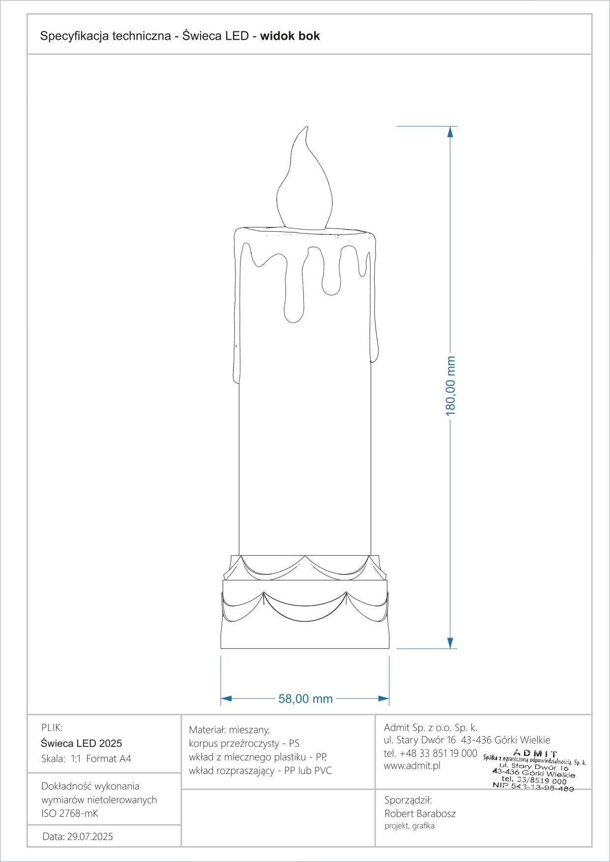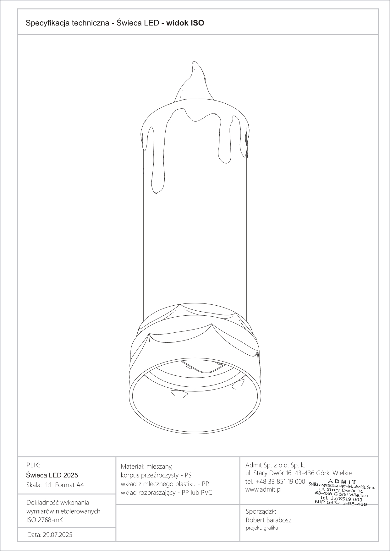 Níže uvádíme Prohlášení o shodě CE pro produkt LED svíčka / elektrická vložka model LD18, výrobce ADMIT Sp. z o. Ó. Sp.k. Dokument potvrzuje, že výrobek splňuje požadavky příslušných směrnic Evropské unie, zejména pokud jde o elektromagnetickou kompatibilitu (EMC) a omezení používání nebezpečných látek v elektrických a elektronických zařízeních (RoHS).